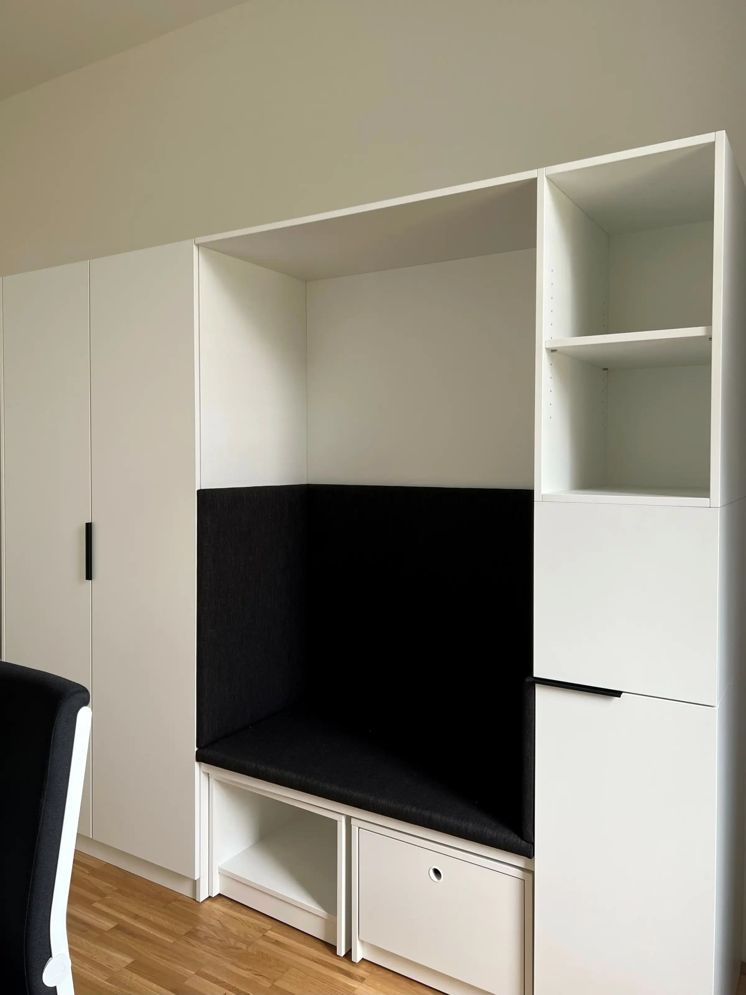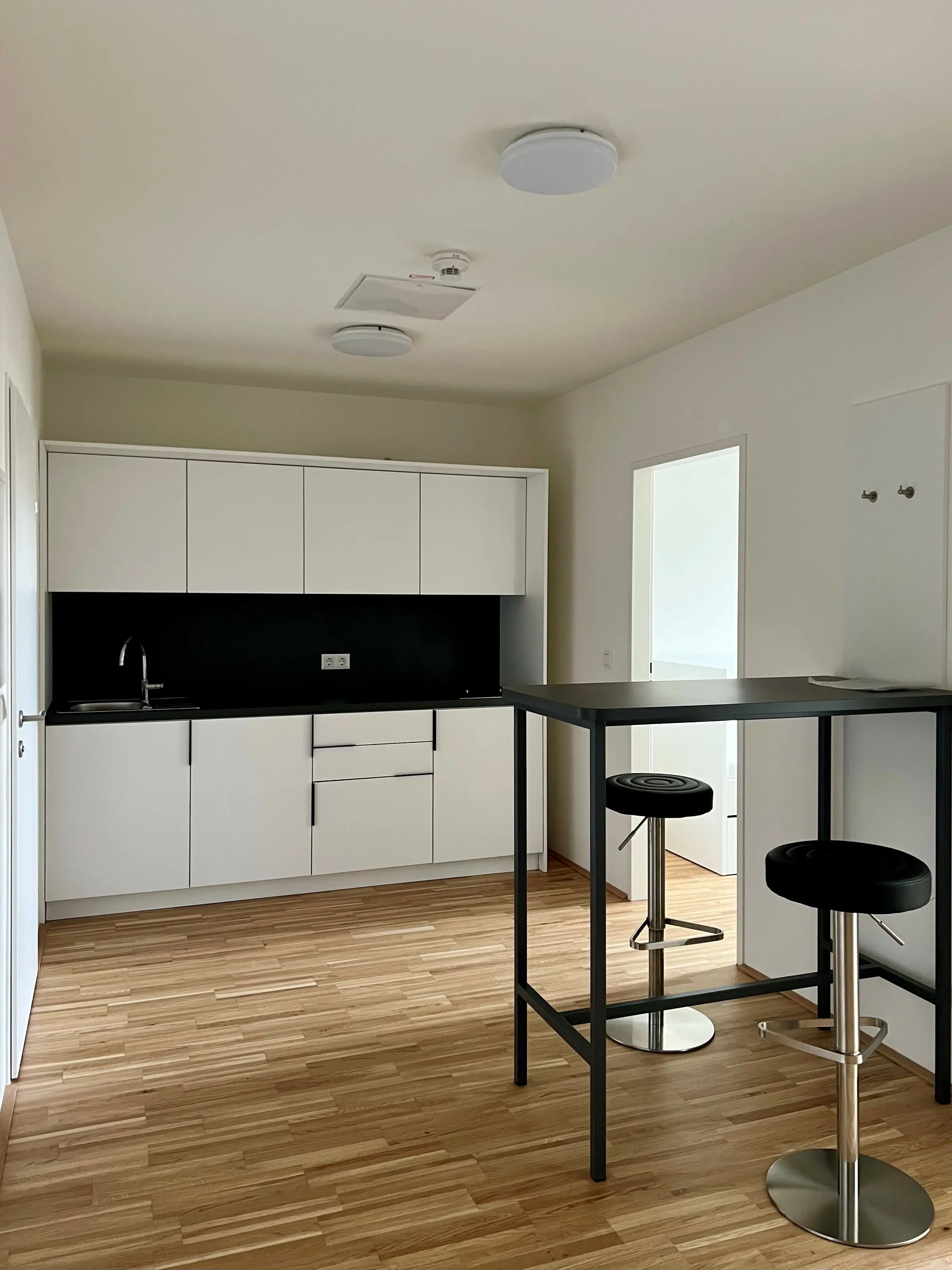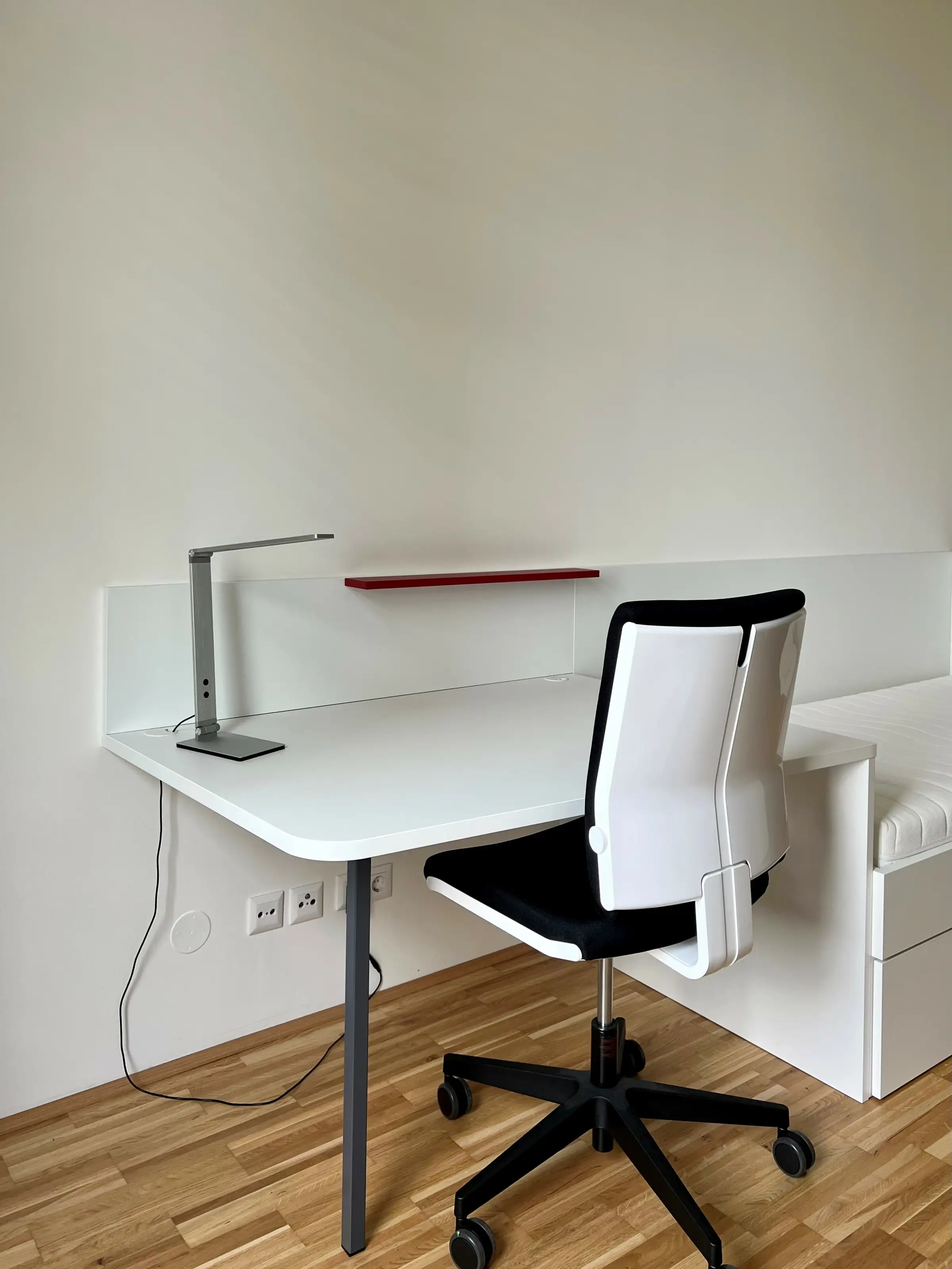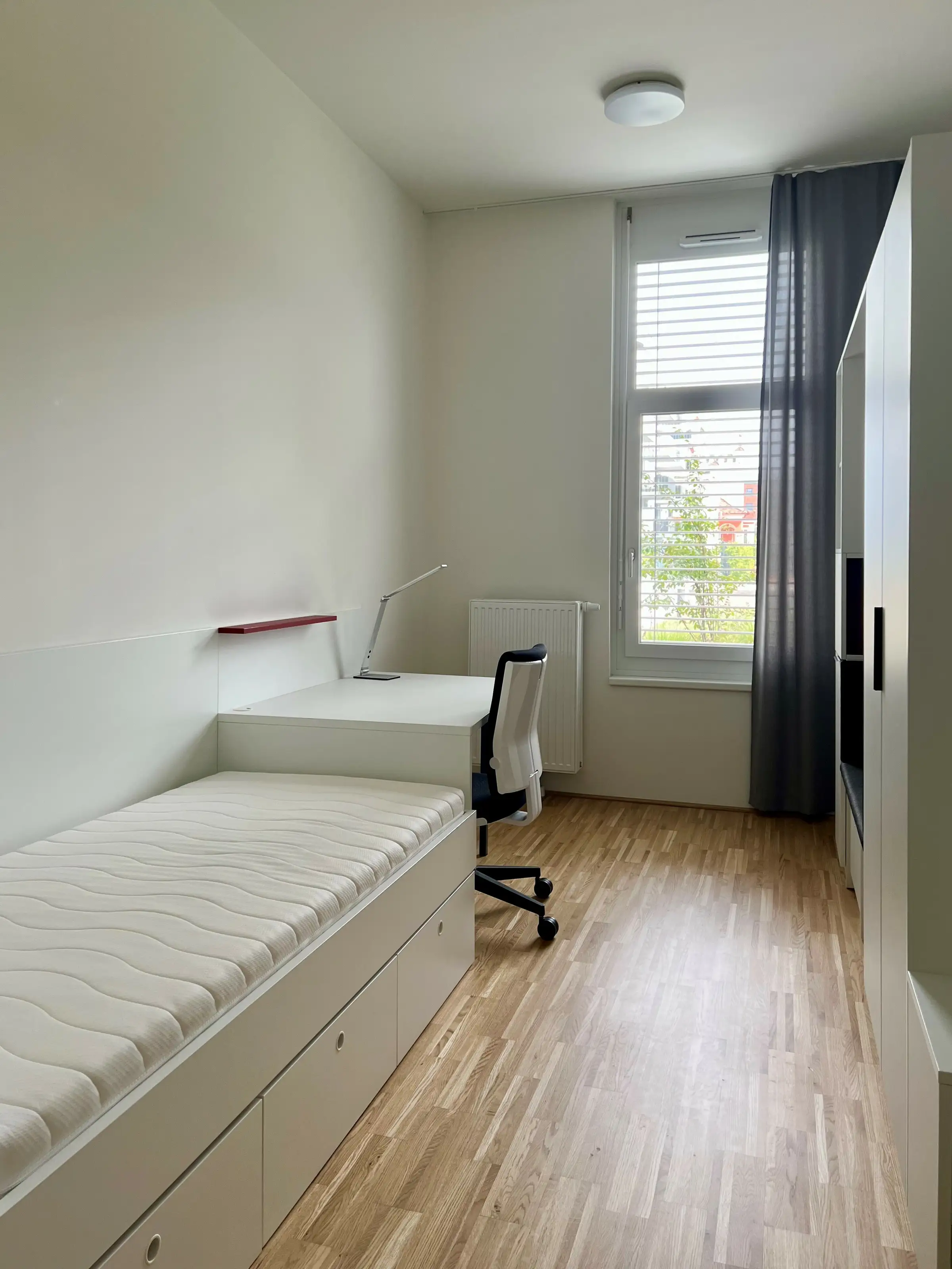 Die Wohnung teilt sich auf in zwei helle Zimmer mit je einem Bett, einem Kleiderschrank, sowie einem Schreibtisch mit Sessel, einem großen Eingangsbereich und einem Badezimmer mit Dusche und WC.